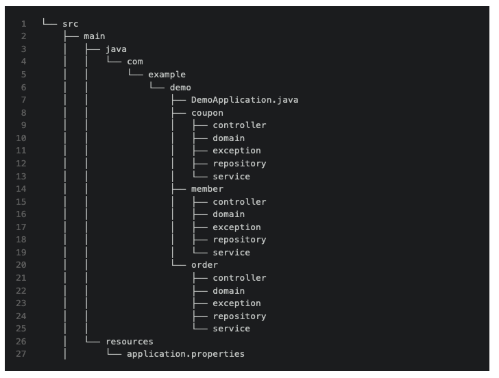 계층형 구조보다 더 나은 구조 없나?.. 둘러보다 사용해본 구조다. 각각의 도메인 (coupon, member, order 등)을 기준으로 패키지를 나눈다. 장점은 계층형보다 도메인을 파악하기 쉽다. 도메인 이름이 패키지 이름에 드러나기 때문이다.